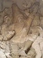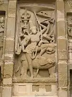 The carving of Shiva on the north facing wall is a composition of Tripurantaka flanked by three ganas, goddess Durga with three ganas, and goddesses Bhairavi, Kaushiki and Jyestha.