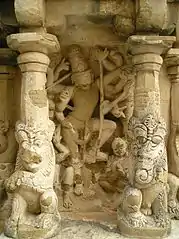 The temple complex is complete in all respects as it has garbagriha (sanctum sanctorum), antarala (inner enclosure), mandapa, a high compound wall, and an entrance gate, the gopuram.[15] The mandapa, which was initially detached, was made part of the main shrine by interposing an ardhamantapa (smaller hall). The pillars of the mandapa have the repetitive features of mythical lion mounts.