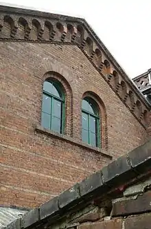 The Royal reception building is a rectangular, single-storey building of exposed red bricks with four towers. The towers each enclose five arched arcades which overlook the free standing area to the east and to the railway tracks to the west. At the track side there are two entrances. From the free standing area by the entrance there was access by horse and carriage. The building is again crowned by an eagle carved out of porcelain, and coloured red. As with the station reception building, the wall surfaces consist of red clay bricks laid horizontally and broken by bands of yellow clay bricks. All joints are mortared with red mortar. The straight lines and the regularity of the brickwork are emphasised by the joint line. The upper level is surrounded by a parapet wall, which incorporates the remaining windows and wall openings.