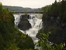 The falls have a drop of 40 m (130 ft),[3] cascading into a gorge carved out of the Precambrian Shield by meltwater following the last glacial maximum.[4] Because of its size and ease of access, it has been consequently nicknamed "the Niagara of the North".