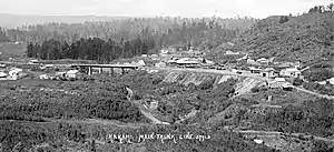 In November 1904 the Public Works Department set up a mill and a horse tramway to cut kahikatea, mataī, rimu and tōtara from 1,200 acres (490 ha), for sleepers, bridges, etc during the NIMT completion, cutting about 11,000 board feet (26 m3), or superficial feet, a day.[30][31][32][33] About 45 staff worked the mill.[34] It was transferred from PWD to NZR on 30 July1909[2] and £3000 was spent on improvements.[35] Electric light was installed in 1912, but in 1914 the tramway was in a bad condition, in 1917 the sawmill was dismantled and in 1921 the sidings were removed. However, in 1955 a siding was provided for Kakahi Timber Co Ltd.[2]
