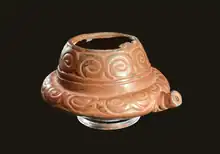 The Kakinoshima site was a community with several pit dwellings, including smaller family homes and some larger homes that were inhabited from 7000 BC to 1000 BC. The dates of the site's habitation correspond to the early, middle, and late subsections of the Jōmon period of Japanese history. The community was positioned on a marine terrace alongside the Pacific Ocean where two large earthen mounds were built by the inhabitants of the site.[1][2] Artifacts found within the site include tablets with footprints that were found in a burial pit, a piece of jade jewelry,[1] and 9,000 year old red lacquerware that are the oldest known pieces of lacquerware in the world.[3]