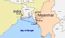 The Kaladan Road Project[1] is a US$484 million project connecting the eastern Indian seaport of Kolkata with Sittwe seaport in Rakhine State, Myanmar by sea. In Myanmar, it will then link Sittwe seaport to Paletwa in Chin State via the Kaladan river boat route, and then from Paletwa by road to Mizoram state in Northeast India. All components of the project, including Sittwe port and power, river dredging, Paletwa jetty, have been completed,[2][3] except the under construction Zorinpui-Paletwa road.[4] Originally, the project was scheduled to be completed by 2014, but end-to-end project is expected to be fully operational only by March 2023 as per March 2021 update.[4]