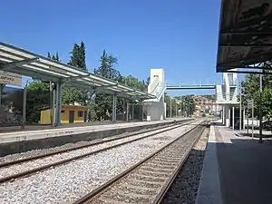 In 2001 the infrastructure element of OSE was created, known as GAIAOSE. It would henceforth be responsible for the maintenance of stations, bridges and other network elements, as well as the leasing and the sale of railway assets.[1] In 2005, TrainOSE was created as a brand within OSE to concentrate on rail services and passenger interfaces. In 2009, with the Greek debt crisis unfolding OSE's Management was forced to reduce services across the network. Timetables were cut back, and routes closed as the government-run entity attempted to reduce overheads. In 2015 a 15-year-old child was airlifted to a hospital after being electrocuted at the station.[9] In 2017 OSE's passenger transport sector was privatised as TrainOSE, currently, a wholly-owned subsidiary of Ferrovie dello Stato Italiane[10] infrastructure, including stations, remained under the control of OSE. In July 2022, the station began being served by Hellenic Train, the rebranded TranOSE[11]