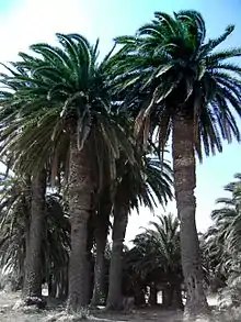 The original twenty-four Canary Island Date Palms (Phoenix canariensis) were planted by the English diplomat Atkinson who brought them from Egypt in the late 19th century. Later when those palms were starting to produce seeds, new palms born around, so that today we can speak for a small but dense palm forest, which at 80% of its palm population is natural and totally (artificial and natural way vegetation) has about 150-155 phoenix canariensis palm trees. The forest continues to propagate new seed palms yet, but it has not been protected by the local authority. These seed palms are food for some local vegetarian animals or being stolen, so the forest spreads out very slowly.