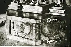 A well-known example is the pair of kalaviṅka carved in openwork (sukashibori) onto a Buddhist hanging ornament called the keman, used in the golden hall of Chūson-ji temple in Iwate Prefecture. The kalaviṅka from this ornament was commemorated on a 120-yen definitive stamp issued Nov. 1, 1962.[7] The pose and general appearance on this piece is similar to the ones seen on the octagonal pedestal of the same temple (pictured right).