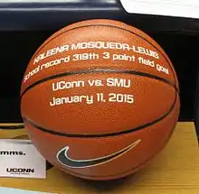 Mosqueda-Lewis is known for her three-point shooting accuracy[9]—she hit a school record nine three-point shots in a game between Mater Dei and Fairfax on March 8, 2011.[10][11][12] She made 337 three-pointers at Mater Dei, more than anyone else in her high school history. In 2015, she broke the NCAA Division I record for career 3-pointers, during UConn's 91–70 regional final win against Dayton.[13] As of that game (including what she achieved in that game) she now has 395 for her career.[13]