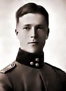 On 1 August 1914, Germany declared war on Russia at the start of World War I.[5] Groundstroem left his theological studies and joined the 27th Jäger Battalion (Finland) as a volunteer on 29 December 1915. [1][2] The Jäger Movement consisted of Finnish volunteers who had slipped away to Germany to train as soldiers and to fight during World War I.[6] Many of these volunteers were motivated by the goal of obtaining Finnish independence from the Russian Empire.[7] Groundstroem was made a lieutenant.[8] He fought in battles on the German Eastern Front on the Misa River, the Gulf of Riga and the Gauja. Groundstroem married Elisabeth Rolfs, a German woman, in 1918.[2]