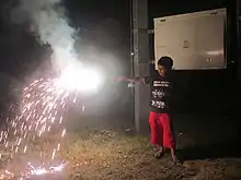The pandals also house images of Kali's consort, Shiva, two famous Bengali Kali devotees named Ramakrishna and Bamakhepa, along with scenes from mythology of Kali and her various forms, including images of the Mahavidyas, sometimes considered as the "ten Kalis." The Mahavidyas is a group of ten Tantric goddesses headed by Kali.[9] People visit these pandals throughout the night. Kali Puja is also the time for magic shows, theater, and fireworks.[7] Recent custom has incorporated wine consumption.[10]