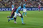 Koulibaly joined Serie A club Napoli on 2 July 2014 on a five-year contract, for a fee around £6.5 million.[35] When the President Aurelio De Laurentiis met Koulibaly for the first time, he expected the player to be 1.92/1.93m tall, as he had read, and said he should have paid him less because he was smaller; Koulibaly replied that he would have delivered his value on the pitch.[36][37] He made his debut on 19 August in a UEFA Champions League play-off round qualifier, in which Napoli drew 1–1 with Athletic Bilbao.[23][38] Napoli went on to lose the second leg 3–1, thus sending them out of the competition.[23][39] Koulibaly made his Serie A debut in the opening game of the season against Genoa, playing the whole match as Napoli won 2–1.[40] He scored his first goal for the side on 24 September in a 3–3 draw with Palermo.[23][41] Koulibaly played in every match from the start of the season, before being sent off for a second bookable offence in a 1–1 draw against Sampdoria on 1 December 2014.[42]