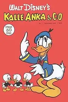 Kalle Anka & C:o (Donald Duck & Co) is a Swedish weekly Disney comics magazine, published by Egmont.[2] The 52-page comic, launched in September 1948, is the overall best-selling Swedish comic magazine.[1] In the early years, the comic printed translated stories from the United States, including Walt Disney's Comics and Stories, Four Color and other Dell Comics Disney titles. As Disney comics production waned in the United States in the 1960s, Kalle Anka began printing more European-produced content, from Scandinavia and Italy. Now, Kalle Anka & C:o and its Scandinavian sister editions Anders And & Co. (Denmark) and Donald Duck & Co (Norway) are identical, apart from the language.