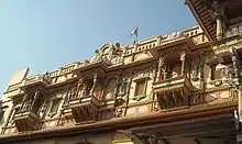 The central gateway of the temple is artistic. It blends local, regional and British styles of architecture and sculpture. Marathi and Rajasthani folk cultures and costumes are evident on the gateway sculptors. The columns are engraved with vertical lining in Corinthian order. The top of the projected pavilions are ruminants of Mughal architecture. Statues of the women wearing frilled blouses and petticoats, carrying their kids on their waist depict the Gujarati women.[7]