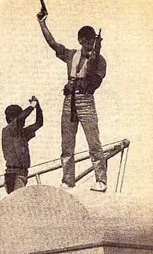 General Aryana also released a statement in which he commended Admiral Habibollahi and his "courageous" commandos. Bakhtiar immediately lent his support to Aryana, projecting a united front in their campaign to liberate Iran. Azadegan deliberately downplayed the fact that the majority of individuals on the Tabarzin were staunch monarchists, which later became a contentious issue among the opposition. When press helicopters flew over the gunboat, the commandos would make V-signs and chant, "Vive Le Roi!" Others held up photos of Reza Pahlavi. One individual, wearing dark glasses and a cap, defiantly posed with a pistol and sub-machine gun. In Tehran, the revolutionary authorities were forced to acknowledge that one of their gunboats had been hijacked by pirates and had gone missing. Later, they accused the Spanish government of not intervening and threatened diplomatic retaliation. However, by then, the Tabarzin was en route to Morocco.[9]