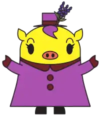 Kamifurano's mascot is Labeton (らべとん, Rabeton). She is a 17-year-old idol pig. Her clothes is scented with lavender. She likes to eat stuff that taste good (such as kiki pork, a type of tonkatsu) and enjoys hot springs scented with lavender. When she is on her break from idoling, she makes potpourri bags and gardening. Her favourite colours are pink and purple. She struggles with dieting, being around narrow places and heights but as an idol, she can overcome them. Per idol tradition, she is forbidden from making any romantic feelings. Her quote is "pure, correct and beautiful" (清く 正しく 美しく). Her birthday is July 28.[1]