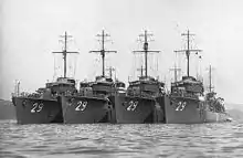 The Kamikaze-class destroyers (神風型駆逐艦, Kamikazegata kuchikukan) were a class of nine destroyers of the Imperial Japanese Navy.[1] Some authors consider the Nokaze, Kamikaze and Mutsuki classes to be extensions of the Minekaze-class destroyers, and the Kamikaze class is sometimes referred to as the "Kiyokaze class" to distinguish it from the earlier World War I-era destroyer class of the same name. Obsolete by the beginning of the Pacific War, the Kamikazes were relegated to mostly secondary roles. Most ultimately were lost to U.S. submarines.