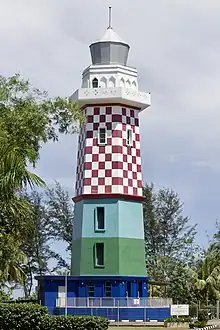 The Lumut Lighthouse sits at the coast of Kampong Sungai Kayu Ara, facing the beach.[13]