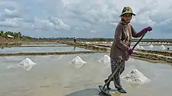 Kampot sea salt (Khmer: កំពតអំបិលសមុទ្រ, French: Sel de mer de Kampot) is extracted from the seawater through salt evaporation ponds in the coastal Kampot and Kep provinces.[1] Salt farms cover around 4,748 hectares of land in both provinces and are owned by 200 families who are members of Kampot-Kep Salt Association.[2]
