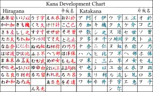 - Katakana (片仮名, fragmented kana) or gojūongana (五十音仮名, fifty-sound kana): a syllabary derived by using bits of characters in man'yōgana, historically sorted in gojūon order.