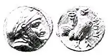 Sophytos and Naratos are not Greek names.[2] They may have been Iranian, their actual names being possibly Subhūti and Nārada.[2] The name "Sophytos" is also known from a 4th-3rd century Greek coins of the Arachosian satrap Sophytos, who is otherwise unknown.[2][3] There is a possibility that the Sophytos of the inscription may have been a descendant of the eponymous Satrap Sophytos.[3]