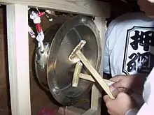 The kane (鉦) is often found in traditional Japanese music or min'yō. Although sometimes suspended from a bar, it is more common for a musician to hold the bell in place with one hand beat it with the other using a special mallet, often made from bone.[1] The kane makes three distinct sounds: chon - hitting the middle; chi - hitting the inside edge; and ki - reversing the stroke. This kind of onomatopoeic mnemonic or shouga is common in Japanese music.[1] There are several sizes of kane, such as the atarigane or the surigane.