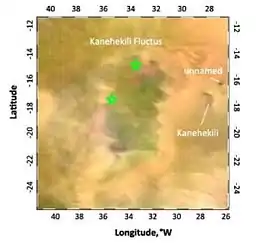 Kanehekili Fluctus is a lava flow field on Jupiter's moon, Io. This fluctus (terrain covered by outflow of liquid, used on Venus, Io and Titan) is located in the sub-Jovian hemisphere at 17.68°S 33.56°W as shown in the picture on the right.[1] Also in the picture is the Kanehekili volcanic center located at 18.21°S 33.6°W.[2] This lava field covers roughly 34,500 square kilometres (13,300 sq mi). The hotspot was detected by the Galileo Solid State Imaging experiment (SSI) on orbits by Galileo.[1]