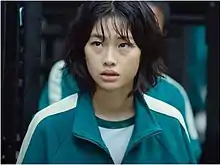 Kang Sae-byeok, also known as Player 067, is portrayed by model HoYeon Jung in her acting debut.[17][18] She studied for her role by practicing Hamgyŏng dialect with real North Korean defectors, watching documentaries about North Korean defectors, and learning martial arts. She also drew upon her own feelings of loneliness while modeling overseas to build the character, and wrote a daily diary from Sae-byeok's perspective.[19][20][21] Following the release of Squid Game, Sae-byeok became the show's breakout star.[22][23][24]