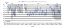 North Melbourne were cellar dwellers for its first twenty-five years of VFL membership and struggled to win matches in the superior VFL competition, with the only bright note being Sel Murray winning the VFL Leading Goalkicker Medal in 1941 with 88 goals. By the late 1940s, North Melbourne had developed a strong list and significant supporter base. In 1949 North secured the VFL Minor Premiership, finishing top of the ladder at the end of the home-and-away season with 14 wins and 5 losses. They failed to make the Grand Final that year (eventually won by Essendon), but in 1950 they did reach the final, defeated by a more efficient Essendon. It was in this year that the club adopted the "Kangaroos" mascot.[11]