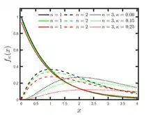 Probability density function ![]() Plot of the κ-Erlang distribution for typical κ-values and n=1, 2,3. The case κ=0 corresponds to the ordinary Erlang distribution. | |||