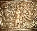 The lid of the casket shows the Buddha on a lotus pedestal, and worshipped by Brahma and Indra. The edge of the lid is decorated by a frieze of flying geese. The body of the casket represents a Kushan monarch, probably Kanishka in person, with the Iranian sun and moon gods on his side. On the sides are two images of a seated Buddha, worshiped by royal figures, can be assumed as Kanishka. A garland, supported by cherubs goes around the scene in typical Hellenistic style.