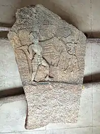 The 5th century AD[5][6] Halmidi inscription 16-line earliest Kannada inscription found at Halmidi in Belur taluk of Hassan district on rectangular sandstone ( 2.5 ft height and 1 ft width) has a Vishnu Chakra on its top. The language of the inscription is in Poorvada Halegannada ( Proto-Kannada). Archaeologist M. H. Krishna found the Brahmi script in the inscription. Shifted the inscription to Archaeological Museum, Mysore and later to Government Museum in Bangalore. Epigraphia Karnataka has dedicated a chapter to study of the inscription. The linguists and writers Govinda Pai, M. Chidananda Murthy, T. V. Venkatachala Sastry, Ram Sri Mugali, R.S. Panchamukhi, D.L. Narasimhachar, and M. M. Kalburgi studied the inscription and published papers. Writers including G. S. Gai, T. A. Gopinatha Rao, T. N. Srikantaiah, Shivarama Aithala, S. Nagaraju, S. Srikanta Sastri, M. Mariyappa Bhatta, M. B. Neginahal, K. V. Ramesh, Devarakondareddy and K. M. Hanumantha Rao have discussed the important issues raised by Halmidi inscription in their books.[12]