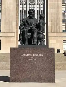 To the south of the building are fountains with two ornamental sea horses, dolphins, and seashells. City employees named the sea horses "Lug" (on the west side) and "Cut" (on the east side) soon after the fountain's dedication. They were named for lugs of the political machine and cuts in pay for city workers in the 1930s. A statue of Abraham Lincoln and his son Tad was sculpted by Lorenzo Ghiglieri.