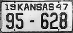 1947 | Embossed black serial on white plate with border line; "19 KANSAS 47" at top | none | 1-12345 10-12345 100-1234 |