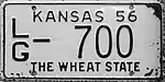 1956 | Embossed black serial on white plate with state-shaped border; "KANSAS 56" centered at top | "THE WHEAT STATE" centered at bottom | A/B-12345 | Coded by county of issuance (A/B) | 1956 was the first year that Kansas plates complied with the new standardized 6" x 12" measurements. |