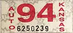 1944 | Embossed red serial on white plate with border line; "KANSAS-44" at top | none | 1-12345 10-12345 100-123 |