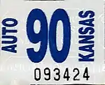 Municipal | 1989 - 1994 | Embossed navy blue serial on white plate with "KANSAS" in navy blue at top | 12345 | Municipal plates use a county sticker in the top left along with the designation sticker at the bottom such as "CITY" or "COUNTY".