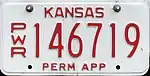 2006 - 2018 | Embossed red serial on white plate with "PWR" at left; "KANSAS" and "PERM APP" in red at top and bottom, respectively | |||