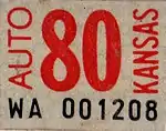 Embossed blue serial on reflective white plate with "KANSAS" and "CYCLE" at top and right, respectively. | A/B 1234 | The debossed "80" and hyphen did not appear on every plate, it depended on the county it was issued to. | |||