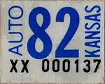 January 1982 – December 1987 | Embossed blue serial on reflective white plate; gold sunflower and wheat stalk graphic screened at top left and "KANSAS" in blue at top | none | A/B C12345 | Coded by county of issuance (A/B) and month of expiration (C) | Issued only to new registrants. Serials in each county, for each month, continued from where the 1980–81 plates left off.[3] |