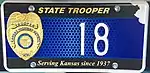 December 2016 – Present | Embossed white serial on blue plate with Kansas Highway Patrol badge at left, "STATE TROOPER" and "Serving Kansas since 1937" in gold at top and bottom, respectively. | 123 | The Kanas Highway Patrol replated their entire fleet in late 2016 with these blue and gold plates in preparation for their 80th anniversary in 2017. |