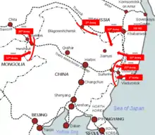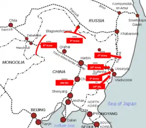 Operationally speaking, Kantokuen was essentially identical to the War Plan of 1940[41] but with an abbreviated force structure (20–30 as opposed to 43 divisions) that presumably banked on the Soviet inability to reinforce the Far East in light of the conflict against Germany. The level of commitment, however, was still enormous and by far the single greatest mobilization in the history of the Japanese Army.[42] To facilitate the operation, a tremendous number of both combat and logistical assets would have to be dispatched to Manchuria on top of the existing structure. In particular, to capitalize on the Japanese advantage of interior lines, the railways in the north and the east had to be expanded to accommodate the increased burden carried by an offensive war.[43] Additionally, port facilities, military housing, and hospitals were also to be augmented.[44] Like the previous concepts drawn up in the aftermath of the Nomonhan Incident, Kantokuen would begin with a massive initial blow on the Ussuri Front against Primorye that would be followed up with another attack to the North against Blagoveshchensk and Kuibyshevka.[45] Under the umbrella organization of the First Area Army, the Japanese Third and Twentieth Armies, supported by the 19th Division of the Korea Army, would penetrate the border south of Lake Khanka to overcome the main Soviet defensive lines and threaten Vladivostok. Simultaneously, the Fifth Army would strike just south of Iman (now Dalnerechensk) to complete the isolation of the Maritime Province, sever the Trans-Siberian Railway, and block any reinforcements arriving from the north. In northern Manchuria, the Fourth Army would at first hold the Amur River line before it transitioned to the offensive against Blagoveshchensk.[46][47] Meanwhile, two reinforced divisions of Japanese troops outside the Kantokuen force structure would start operations against Northern Sakhalin from both the landward and the seaward sides with the aim of wiping out the defenders there in a pincer movement.[48] Other second-stage objectives included the capture of Khabarovsk, Komsomolsk, Skovorodino, Sovetskaya Gavan, and Nikolayevsk. Additionally, amphibious operations against Petropavlovsk-Kamchatsky and other parts of the Kamchatka Peninsula were contemplated.[49][50]