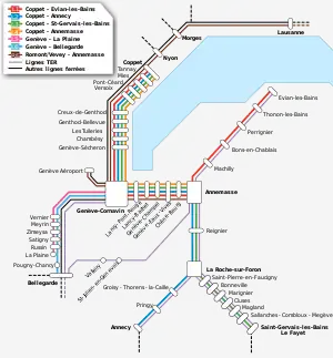 After the inauguration of the missing rail link between Geneva and the border French city of Annemasse and the creation of the Léman Express in 2019, many secondary bus routes were re-designed as feeders to the new train stations. Soon after the opening of the rail network and prior to the COVID-19 crisis in 2020, it had met all its expectations in terms of passenger numbers with 25,000 daily users.[80] Several municipalities of the canton, especially those in the Mandement (Satigny, Russin, Dardagny), and those on the right-bank of the lake (from Chambésy to Versoix) rely heavily on the rail for their commuting.
