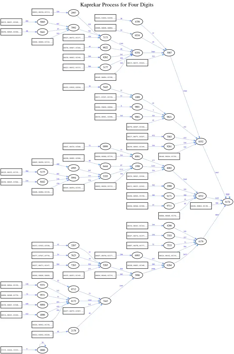 The set of numbers that converge to zero depends on whether leading zeros are discarded (the usual formulation) or are retained (as in Kaprekar's original formulation). In the usual formulation, there are 77 four-digit numbers that converge to zero,[10] for example 2111. However, in Kaprekar's original formulation the leading zeros are retained, and only repdigits such as 1111 or 2222 map to zero. This contrast is illustrated below: