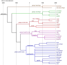 Kaqchikel dialects differ somewhat in their vowel inventories. Each dialect has a set of five tense vowels and either one, two, four, or five lax vowels.[5] The chart below shows all the possible vowels that can occur in dialects of Kaqchikel. Although the dialect of Sololá uses the maximal ten-vowel system with all the vowels except schwa /ə/, the dialects of San Juan Sacatepéquez and San Andrés Semetabaj only use the five tense vowels and schwa.