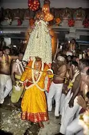 The ritual pot filled with water and adorned with decorations several feet high is carried by the priest. The dancers perform various acrobatic feats while following the procession accompanied by a number of musical instruments like 'Thavi', "Nadaswaram", "Muni", "Udukka", "Pamba", etc.[1]