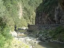 The Karangahake Gorge lies between the Coromandel and Kaimai ranges, at the southern end of the Coromandel Peninsula in New Zealand's North Island. A sharply winding canyon, it was formed by the Ohinemuri River. State Highway 2 passes through this gorge between the towns of Paeroa, Waikino and Waihi. This road is the main link between the Waikato region and the Bay of Plenty.