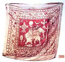 The battle flag of Sri Lanka, captured by the British from Sri Wikrama Rajasinghe's army. It displays the kettle drum which was beaten before battles and five weapons (panchaudha). In the past, a medallion with panchaudha symbols used to be tied on Karava infants for protection. The practice still survives in rural Sri Lanka and has been now adopted by other communities as well.