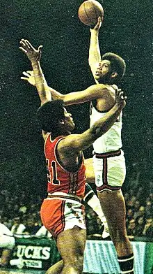 Alcindor displaying the skyhook over Wes Unseld of the Baltimore Bullets. The shot was almost impossible to block.