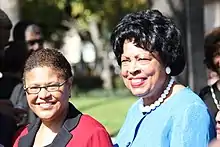Karen Ruth Bass (/ˈbæs/; born October 3, 1953) is an American politician, social worker and former physician assistant who has been serving as the 43rd mayor of Los Angeles since 2022.[1][2] A member of the Democratic Party, Bass had previously served in the U.S. House of Representatives from 2011 to 2022, representing California's 33rd congressional district from 2011 to 2013 and California's 37th congressional district from 2013 to 2022. She also served in the California State Assembly from 2004 to 2010 and spent her final term serving as speaker.[3][4][5][6][7]