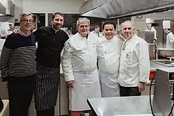 Nowadays, more and more Asian fast food chains (such as The Pizza Company, Lotteria, Pepper Lunch, Yoshinoya and Bonchon)[24] and Western fast food chains (such as Burger King, KFC, Krispy Kreme and Carl's Jr.) are entering the Cambodian market, especially in Phnom Penh, and fast food is becoming increasingly integrated into the Cambodian food scene, particularly among the younger generation.[25] In 2004 Malis, the first Cambodian fine dining restaurant in Phnom Penh, was opened.[26] Since the early 2010s there has been an emerging grassroots culinary movement in Siem Reap termed "New Cambodian Cuisine" loosely consisting of six Cambodian chefs and restaurateurs (Pola Siv, Sothea Seng, Pol Kimsan and Sok Kimsan, Mengly Mork and Pheak Tim) experimenting with and modernizing traditional Cambodian dishes.[27] More recently, mobile applications dedicated to Khmer traditional recipes have also been developed, such as "Khmer Cooking Recipe" downloaded more than 100,000 times on Google Play and "Khmer Cooking".[28]