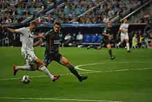 Benzema made his league debut for Madrid on 29 August 2009 against Deportivo La Coruña. He started the match, but was substituted out in the second half as Madrid won 3–2.[74] A month later, he scored his first goal for the club in a 5–0 victory against newly promoted Xerez.[75] After missing the mid-week match against Villarreal, against Tenerife at the weekend, Benzema scored his first double for Madrid in a 3–0 home victory.[76] He made his Champions League debut for the club on 30 September in a group stage tie against Marseille.[77] After failing to score a goal in the month of October, in the team's first match in November against Italian club Milan in the Champions League, Benzema scored the opener to give Madrid a 1–0 lead. His goal was later cancelled out by a Ronaldinho penalty.[78]
